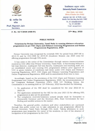 தமிழ்நாட்டில் பெரியார் பல்கலைக்கழகம் முழு நேர இயக்குநர், போதிய முழுநேர ஆசிரியர்கள், போதிய ஆசிரியர் அல்லாத பணியாளர்கள், இன்னும் மையம் அமைக்கப்படாதது, ODL நிகழ்ச்சிகள் இல்லாமல் இயங்கி வருகிறது என UGC அலுவலகத்தில் வந்த பல்வேறு தகவல்களின் மூலம் ஆணையத்தின் கவனத்திற்கு வந்துள்ளது. UGC (Open and Distance Learning Regulations, 2017, UGC (Open and Distance Learning Programs and Online Programs) விதிமுறைகள், 2020 மற்றும் அவ்வப்போது அதன் திருத்தங்கள் ஆகியவற்றின் கீழ் வகுக்கப்பட்ட நிபந்தனைகளை மொத்தமாக மீறும் வகையில் UGC இன் முன் அனுமதி.