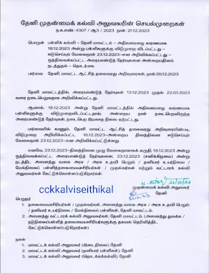 23.12.2023 சனிக்கிழமை மழை விடுமுறையை ஈடு செய்யும் வேலை நாள் - முதன்மைக்கல்வி அலுவலரின் செயல்முறைகள்.