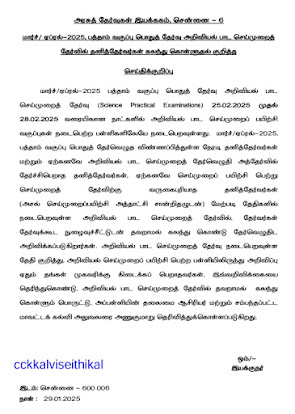 SSLC தனித் தேர்வர்களுக்கான (Private Candidates) அறிவியல் பாட செய்முறைத் தேர்வு தேதிகள் அறிவிப்பு.
