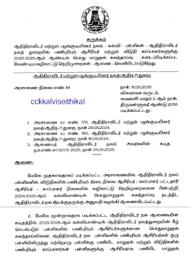 ஆதி திராவிடர் நலத் துறையில் பணிபுரியும் ஆசிரியர்கள் மற்றும் விடுதிக் காப்பாளர்களுக்கு 12.06.2025 மற்றும் 13.06.2025 ஆகிய தேதிகளில் இணையவழி மூலமாக மாறுதல் கலந்தாய்வு நடத்துதல் சார்ந்து அரசாணை மற்றும் வழிகாட்டி நெறிமுறைகள் வெளியிடப்பட்டுள்ளது.